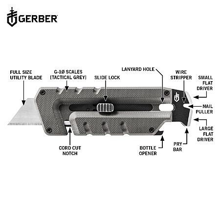 • The Gerber Prybrid utility razor knife features an exchangeable standard No. 11 utility blade with slide lock, wire stripper, small flat driver, large flat driver, nail puller, pry bar, bottle opener, and cord cut notch