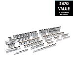 • Contains fifty-two (52) 1/4-inch, sixty-seven (67) 3/8-inch and eighty-six (86) 1/2-inch drive sockets plus four (4) 3/8-inch and two (2) 1/2-inch drive spark plug sockets