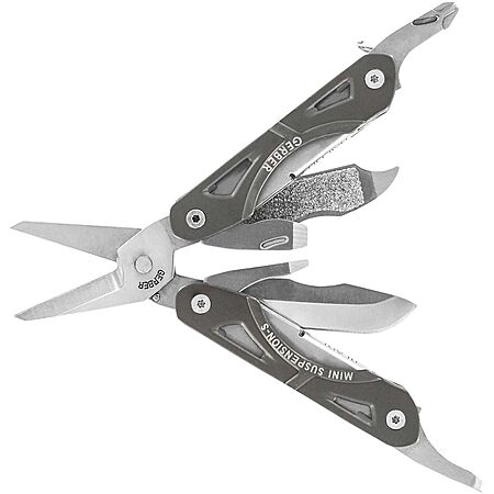 • Stainless steel mini suspension multitool offers spring loaded pliers, a knife blade, a Phillips head screwdriver, a small flat head screwdriver, tweezers, a nail file, a nail scrapper and a lanyard hole