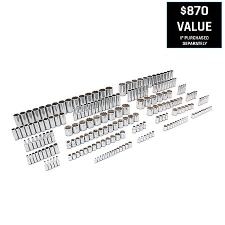 Contains fifty-two (52) 1/4-inch, sixty-six (66) 3/8-inch and ninety-four (94) 1/2-inch drive sockets