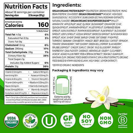 - Go to 2.02 lbs Orgain Organic Vegan Protein + Superfoods Powder (Vanilla Bean)