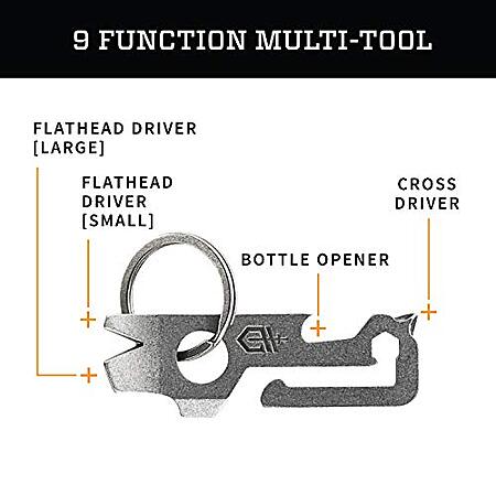 • 9-in-1: Features a pry bar, nail puller, scraper, bottle opener, small flathead driver, large flathead driver, 1/4" hex driver, wire cutter/stripper, cross driver, and belt loop hanger