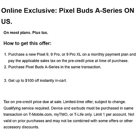 - Purchase a Google Pixel 9 on a monthly payment plan and pay the applicable sales tax on the pre-credit price at time of purchase; plus $35 device connection charge.