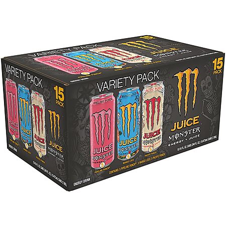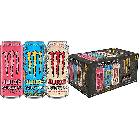 Model: Monster Energy Juice Monster Variety Pack, Pipeline Punch, Mango Loco, Pacific Punch, Energy+Juice, Energy Drink, 16 Ounce (Pack of 15)