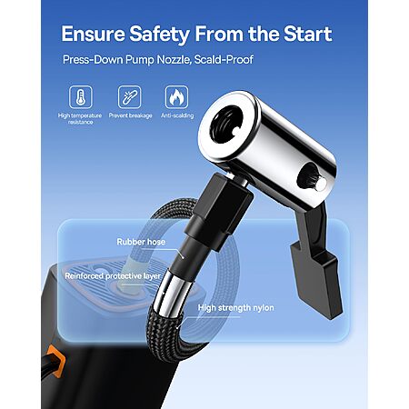4. Wide Usage Senario: Package come with Tire inflator portable air compressor*1, American Nozzle (Cars, motorcycles, electric bikes)*1, French Nozzle (Racing bicycles, mountain bikes)*1, Ball Nozzle (Basketballs, soccer balls, volleyballs)*1, Type-C Charging Cable*1, User Manual*1