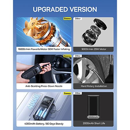 1. Fast and Powerful Tire Inflation: Equipped with a 17-cylinder motor with 50W high power and 16,000rpm rotating speed