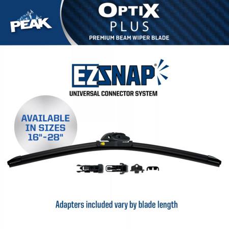 PEAK® OPTIX® PLUS wiper blades are equipped with an EZ-SNAP® Universal Connector System which fits most wiper blade arms, and installation is quick with easy-to-follow instructions inside the package.