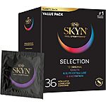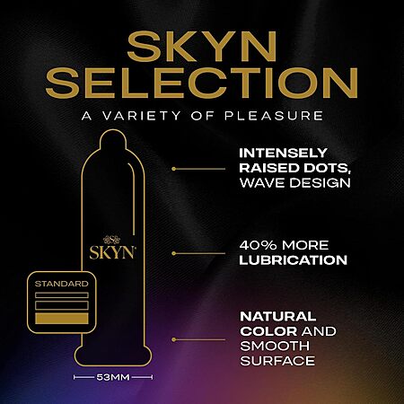 Variety of sensations: SKYN Selection Variety pack features 4 types of assorted lubricated non-latex condoms including 12 Original, 6 Excitation, 6 Elite, and 12 Elite Extra Lube condoms