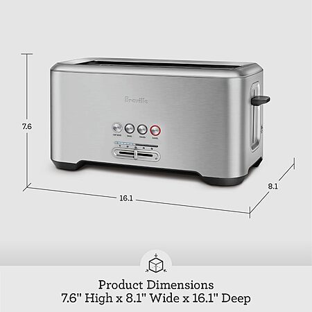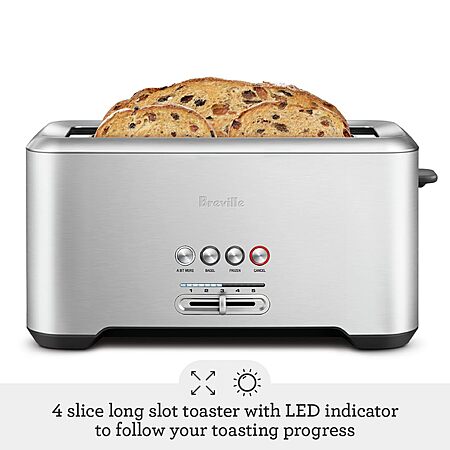 The Breville Bit More is a long 4-slice toaster with an LED that allows you to monitor your progress; If you feel you need 'A Bit More' simply press a button to add a little extra time to the toasting cycle or check on your toast with "Lift & Look"