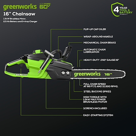 | Product Description: | Work smarter and enjoy constant, fade-free power with the Greenworks 60V, 2kW battery-powered 16 in. Cordless Lithium-Ion Brushless Chainsaw, 38cc Gas Chainsaw Equivalent, CS60L2510, with up to 90 cuts on a single charge, this lightweight, quiet-running saw features chain speeds up to 66 ft/s for fast cuts with no bogging down, heat-treated steel bucking spikes for gripping wood securely, mechanical-activated chain brake for kick-back protection, and automatic chain oiler that keeps chain perfectly lubricated. With hassle-free, trigger starts, you'll get to work fast, with no priming, choke, no pull cord; plus, battery fully recharges in just 50 minutes. Greenworks exclusive Intelligent Power combines Brushless motor technology, lithium-ion battery power, superior cutting, and ultra-fast control systems for power output equivalent to a 38cc gas-powered motor. I includes 2.5 Ah lithium-ion battery and charger. Battery is compatible with 75+ Greenworks Pro 60V products. New Greenworks 60V 16" 1.5kW Brushless Chainsaw: Runtime: Up to 90 cuts on a single charge Power equivalent: 38cc gas-equivalent power Charge time: Fully recharge in 50 minutes with charger 1.5kW brushless motor: Powerful direct drive system Low kickback: Mechanical chain break 20% lighter than gas: ergonomic, low vibration and lightweight |