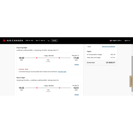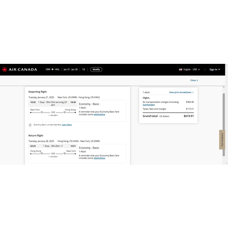 RT New Jersey to Hong Kong $620-$667 Airfares on Air Canada BE with 1 Free Checked Bag (Limited Travel January - March 2025)