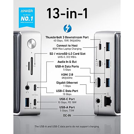 Anker 577 Docking Station: 13-in-1 Thunderbolt 3 Hub w/ 85W Laptop Charging, 4K Dual Display, USB-C & More $119.99 + Free Shipping for Prime Members