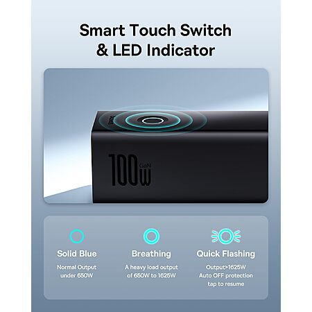 - Baseus outlet extender has a power button with 3 pulsing modes to indicate the charging status and actively cuts the power off, protecting your charging safety.