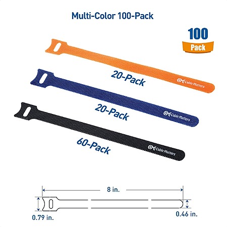 Model: Cable Matters 100-Pack 8-inch Hook-and-Loop Reusable Wire Ties/Cable Ties with 42 lbs Tensile Strength - Multi-Color Black, Blue, and Orange Cord Ties, Cord Wrap, Zip Ties, Cable Management Straps