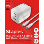Staples TECH 65W GaN 3-port USB-C/C/A Wall Charger with Cable $19.99