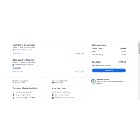 Alaska, United Airlines and Expedia have round trip airfares travelling to and from Nashville TN (BNA) and Kailua-Kona Hawaii (KOA) for $380, making 1 stop both ways. These are basic economy fares, a restricted-type fare. On Alaska/Hawaiian that allow a personal item and a carry-on bag. On United you are only allowed a personal item. There is no seat selection and no change. If you are travelling with children, you will be seated together as per United and Alaska's policy.