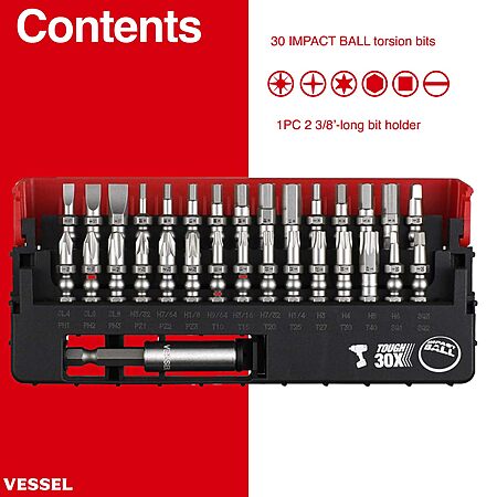 30+1 Piece Vessel Impact Ball Torsion Bit Set w/ Slide Case