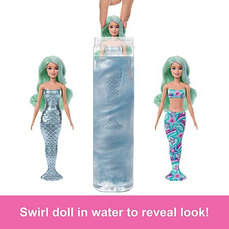 - Start by removing the outer layer of packaging, opening the tube and pulling out a Barbie fashion doll, whose mermaid look is covered in a Color Reveal shimmer sea spray coating and surprise bags!
