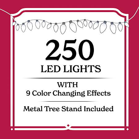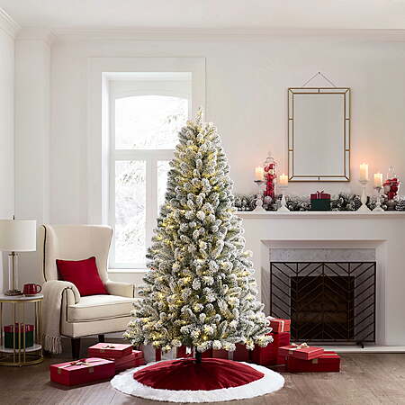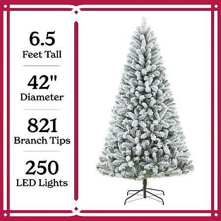 Bring the look and feel of a snow-capped forest into your home for Christmas with the sparkle of the Holiday Time 6.5-Foot Pre-Lit Flocked Frisco Pine Christmas Tree. Featuring a full look of 821 flocked branch tips, the tree shines anywhere it is placed with natural-looking needles and 250 color-changing LED lights with 9 functions. This delightful holiday tree makes a classically elegant statement of Christmas cheer and comes with a metal tree stand to provide a reliable support base. Perfect for decorating or simply using on its own, the tree stands 6.5 feet tall and 42 inches in diameter, making it perfect for medium to large rooms to get everyone in the holiday mood. Assembly and set up are easy with the included instructions. With an extra sturdy top branch for your favorite star, angel, or other tree toppers, the Holiday Time 6.5-Foot Pre-Lit Flocked Frisco Pine Christmas Tree is a wonderful Christmas decoration to be used year after year.