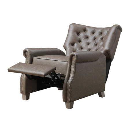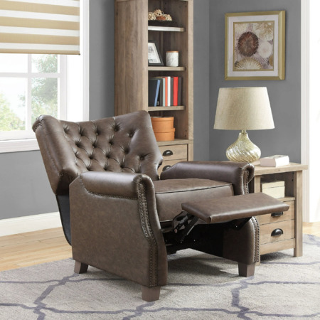 • This elegant recliner features a contemporary button-tufted chair back design and stylish nailhead trim that brings a classic touch to this modern chair.