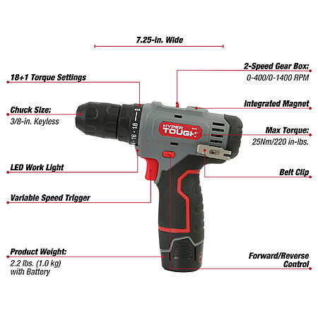 Hyper Tough 12V Max Cordless 2-Speed Drill Driver w/ 1.5Ah Battery & Charger