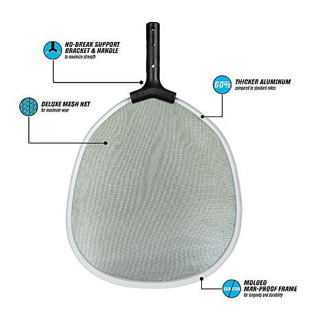 The Pool Spa Pro Deluxe Leaf Skimmer ensures a thorough clean every time. The inner frame features heavy-duty premium-grade aluminum that is 60% thicker than standard skimmer frames. A mar-proof PVC frame is added with an extra-strength bracket and handle made from a blend of Polyamide and glass fiber that is unbreakable. The deluxe Nylon net and provides maximum wear. For use with standard pool poles - sold separately Pool Spa Pro Deluxe Swimming Pool and Spa Leaf Skimmer No-break support bracket and handle to maximize strength 60% thicker premium-grade aluminum to accommodate heavy-loads Maximum-wear nylon net integrated into a molded mar-proof rim For use with standard pool poles Please Note: Pool pole sold separately