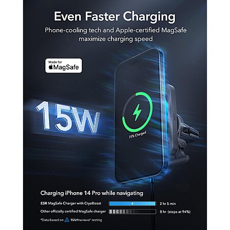 Model: ESR for 15W MagSafe Car Mount Charger with CryoBoost, Made for Apple-Certified, for MagSafe Car Charger, Magnetic Wireless Car Charger for iPhone 15/14/13/12, Fast Charging, Phone-Cooling Charger