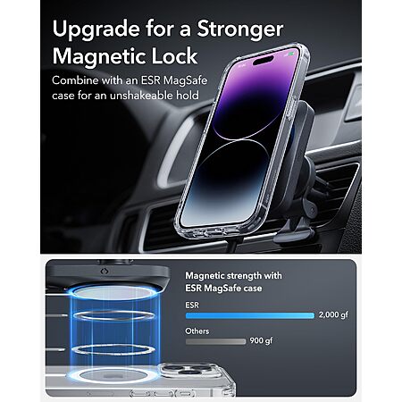 Secure Magnetic Lock: built-in magnets lock onto ESR MagSafe cases with 2,000 g of holding force to keep your phone powerfully secure over even the bumpiest roads