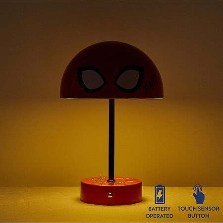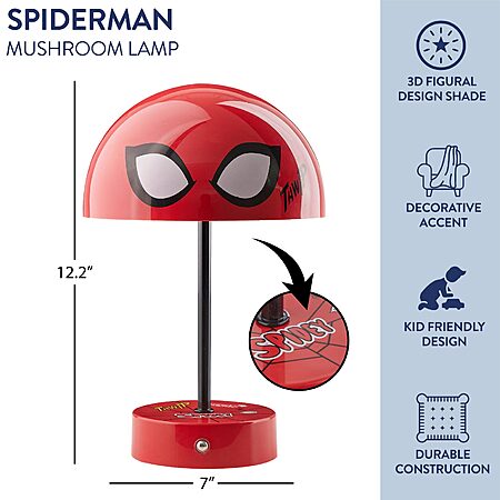 Illuminate your space with the heroic flair of the Marvel Spider-Man Mushroom Table Lamp. Featuring a dynamic design, this lamp adds a touch of adventure to any room. The lampshade showcases Spider-Man swinging into action amidst a colorful mushroom motif, creating an exciting and inviting atmosphere. Perfect for bedrooms, playrooms, or as a bold accent piece, this lamp is sure to thrill fans of all ages. Its compact size makes it versatile for various spaces, while the sturdy base ensures stability. Brighten your room with the Marvel Spider-Man Mushroom Table Lamp - a must-have for any Spider-Man enthusiast. Character Mushroom Table Lamp Battery-operated Adds a bold, colorful design to any space Perfectly sized for any of your little one's spaces at 11.42" tall