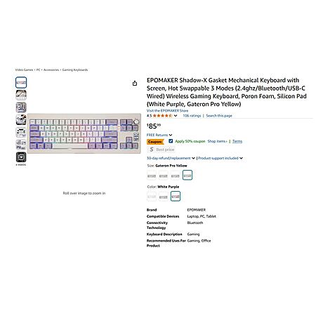 EPOMAKER Shadow-X Gasket Mechanical Keyboard with Screen(White Purple, Gateron Pro Yellow) $42.99 with 50% off coupon