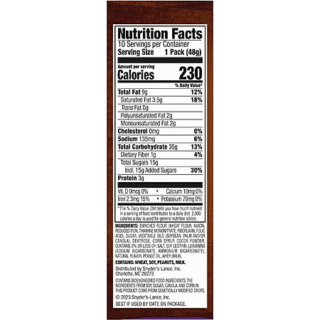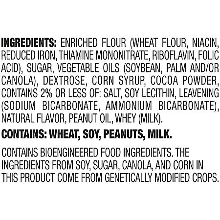 Ingredients: Enriched Flour (Wheat Flour, Niacin, Reduced Iron, Thiamine Mononitrate, Riboflavin, Folic Acid), Sugar, Vegetable Oils (Soybean, Palm And/Or Canola), Dextrose, Corn Syrup, Cocoa Powder, Contains 2% Or Less Of: Salt, Soy Lecithin, Leavening (Sodium Bicarbonate, Ammonium Bicarbonate), Natural Flavor, Peanut Oil, Whey (Milk). Contains: Wheat, Soy, Peanuts, Milk.