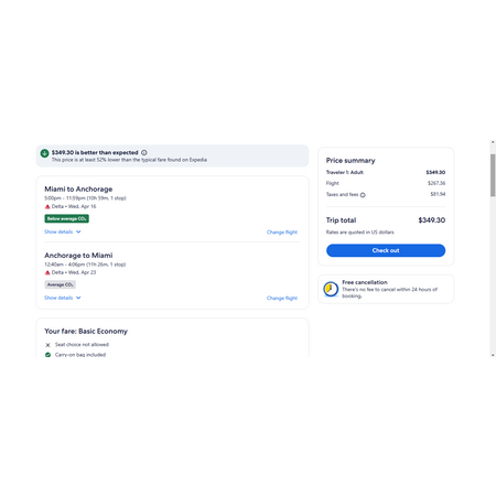 Delta Air Lines and Expedia have round trip airfares travelling to and from Miami (MIA) and Anchorage Alaska (ANC) for $350, making 1 stop both ways. These are basic economy fares that allow a personal item and a carry-on bag. There is no seat selection and no change.