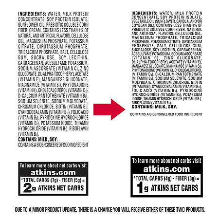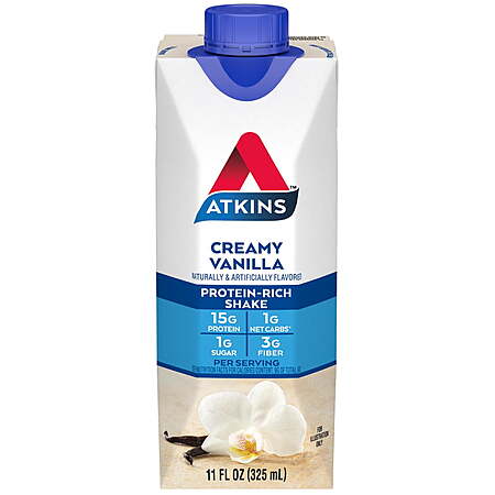 Enjoy Atkins™ Creamy Vanilla Protein Shakes. Each delicious creamy vanilla flavored protein shake delivers 15g of protein to satisfy your hunger and keep you moving. These low sugar*, low carb* creamy shakes are a great choice for when you’re on the go but don’t want to sacrifice great taste or settle for something with a ton of sugar or net carbs. Atkins Creamy Vanilla Protein Shakes are keto friendly*, a good source of fiber*, contain no artificial growth hormones, and have 2g of net carbs and 1g of sugar per serving*. AT HOME OR ON-THE-GO. Atkins Creamy Vanilla Protein Shakes. Enjoy delicious shakes that fit right into your busy schedule, with 15g of protein, 2g of net carbs and 1g of sugar per serving*. This is Today’s Atkins™. YOUR APPROACH. Help give your body the nutrients it needs without sacrificing your favorite flavors. AMAZING RECIPES. Delight in the nutrients and satisfying flavors of great foods made with quality ingredients. Offered in 4ct or 12ct cartons containing individually bottled 11 fl oz shakes. TASTE WHAT’S GOOD. Stay true to your low carb lifestyle with these delicious protein shakes. *See Nutrition Facts for Calories and Saturated Fat Contents. Fiber: 9g Total Fat per serving. Low Sugar: 1g Total Sugar per Serving. Not a low calorie food. Low Carb: 4g Total Carbs, 1g Net Carbs per serving. Keto Friendly: When used with Atkins Ketogenic programs. Visit Atkins.com/how-it-works/keto.