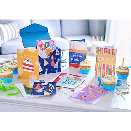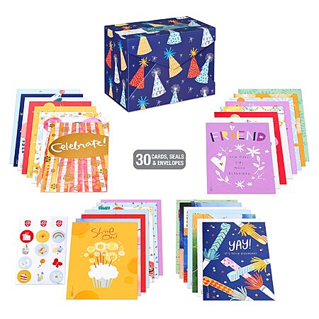 Amazon [amazon.com] has 30-Count American Greetings Birthday Card Assortment w/ Envelopes, Seals, & Storage Box for $8.72. Shipping is free w/ Prime or on $35+.