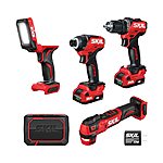 | Product Description: | Get the everyday project essentials you need with the SKIL Brushless 12V 5-Tool Combo Kit. Loosen large bolts, drive screws through thick surfaces, and take on the toughest materials with the Brushless 12V ¼-Inch Hex Impact Driver’s 1, 500 inch-pounds of torque. Enjoy precise control with the Brushless 12V ½-Inch Drill Driver’s variable speed trigger and change bits quickly and easily with its ½-inch single-sleeve keyless chuck. The Brushless 12V Oscillating Multi-Tool makes automatic adjustments based on your project with 6-Speed Auto Sensing™, and the 12V Area Light directs up to 400 lumens of light where you need it with its 120-degree pivoting head. Fill the workspace with quality sound and connect wirelessly to the 12V Bluetooth Speaker from up to 100 feet away. The two included 12V 2.0Ah USB-C batteries feature two-way rapid charging that allows you to charge the battery or portable devices with its 60W USB-C port. When it’s time to recharge the battery, the multifunctional charger ditches the traditional power tool charging dock for a compact, convenient format that can plug in anywhere. Designed for compact power, efficiency, and performance, this cordless electric power tool combo kit includes the cordless 12V ½-Inch Drill Driver, cordless 12V ¼-Inch Hex Impact Driver, cordless 12V Oscillating Multi-Tool, cordless 12V LED Area Light, 12V Bluetooth Speaker, (2) 12V 2.0Ah USB-C batteries, 20W USB-C charger, USB-C charging cable, two PH2 bits, two belt clips, 10 pieces of sanding paper, a sanding pad, a bi-metal plunge blade, and speaker AUX cable. SKIL PWR CORE 12-volt 5-Tool Brushless Power Tool Combo Kit (2-Batteries and Charger Included) | CB8368A-21 |