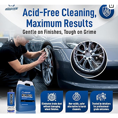 • Professional-grade wheel and tire cleaner that forgoes caustic acids and instead relies on smart chemistry. Safe on clear-coated, powder-coated, chrome, alloy, and factory painted wheels. Nanoskin Non Acid gets to work fast and dissolves stubborn metallic contamination.