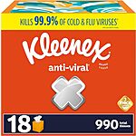 Amazon has 990-Count (18-Pack of 55-Count Boxes) Kleenex Anti-Viral 3-Ply Facial Tissues on sale for $19.86 - $2.98 (15% Clip Coupon on the page) - $0.99 (5% checkout with Subscribe & Save) = $15.89. Shipping is free w/ Prime or on $35+ orders.