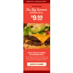 *Offer valid at participating locations for a limited time starting January 27, 2025 for one RED'S DOUBLETM Tavern Burger, served with choice of one of our standard Bottomless Sides and a Bottomless Beverage of Soda, Regular Lemonade or Iced Tea. Offer excludes Freckled Lemonades, Signature Beverages, Root Beer Floats, Cream Sodas and Shakes. Standard Bottomless Sides are included in $9.99 offer; additional fee applies to upgrade side. See our menu for a list of all sides and pricing. No cash value. $9.99 offer does not include tax and gratuity, modifications, or substitutions. We reserve the right to discontinue this offer at any time. Excludes catering and third-party delivery orders. Offer cannot be combined with any other offer, including Red Robin Royalty® offers. Must use promo code BIGYUMMM to redeem.