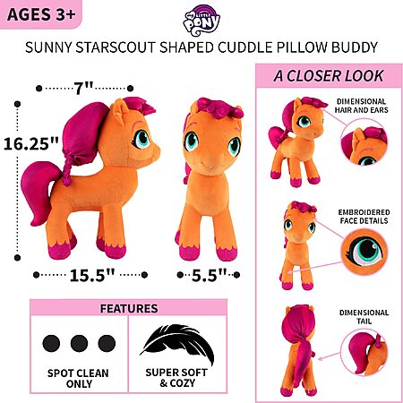 Amazon [amazon.com] has 16" My Little Pony Sunny Starscout Kids Plush for $9.99. Shipping is free w/ Prime or on $35+.Note: 100% Polyester. 16.25" x 15.5" x 5.5".