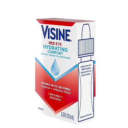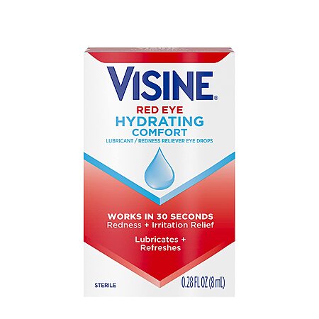Product Description from Amazon- 0.28-fluid ounce bottle of Visine Red Eye Hydrating Comfort Redness Relief Eye Drops to offer eye redness relief in 30 seconds and lubricate irritated eyes