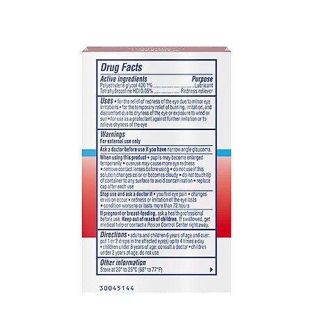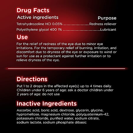 - Formula contains 1% polyethylene glycol 400 and 0.05% tetrahydrozoline HCl which helps lubricate, refresh and relieve red irritated eyes