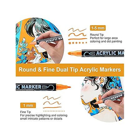 Features:- Each acrylic paint marker features two wear-resistant fiber nibs to meet different coloring needs, eliminating the hassle of switching nibs and offering greater convenience for your creations. The 1-5mm round tip is ideal for painting large areas, while the 1mm fine tip is perfect for outlining and fine-line work.