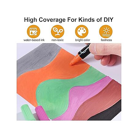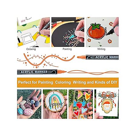 - Dual-tip acrylic paint pens work on almost any surface, not only paper but also beautifully on rocks, wood, mugs, canvas, fabric, leather, ceramics, tiles, glass, resin, tires, blackboard, window, car, Christmas ornament, jar labels, add decoration to graffiti, card making, bullet journal, pumpkin designs, easter eggs, and other smooth or porous surfaces.