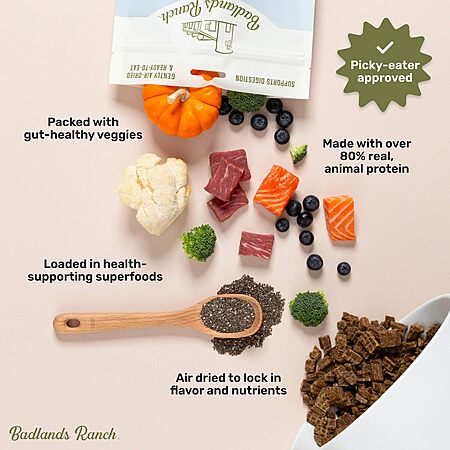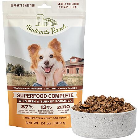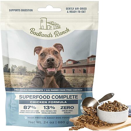 24-Oz Badlands Ranch SuperFood Complete Air-Dried High Protein Adult Dog Food (3 flavors) $30.09, 64-Oz (3 flavors) $73.49 w/ S&S + Free Shipping w/ Prime or on $35+