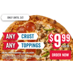 Dominos Pizza offers Large Any Crust, Any Toppings Pizza for $9.99 each when you order online. Valid at participating locations for carryout or delivery through March 2, 2025.