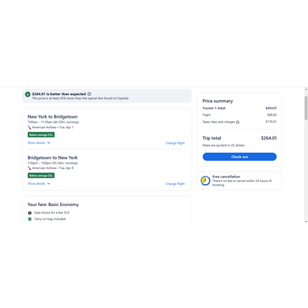 American Airlines, JetBlue and Expedia have round trip airfares travelling from New York (JFK) to Bridgetown Barbados (BGI) for $265, nonstop. These are basic economy fares that allow a personal item and a carry-on bag. There is no seat selection and no change. However, if you are travelling with children, you will be seated together as per each airlines' policy.