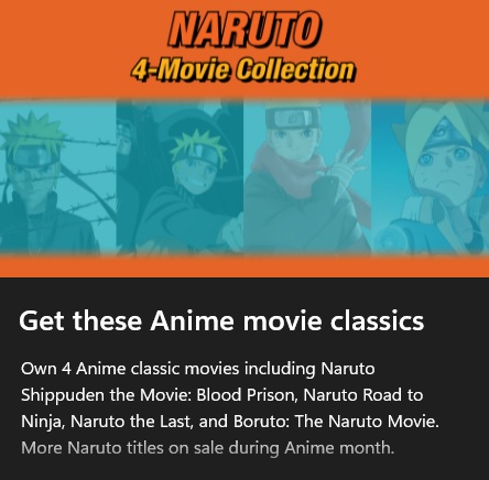 Xbox via Microsoft Store has for Xbox Game Pass Ultimate Members (membership info): Naruto 4-Movie Collection (Digital HD Anime Films) for Free when you follow the deal instructions below.