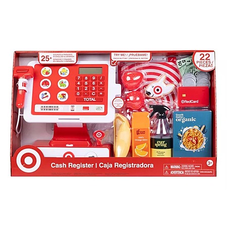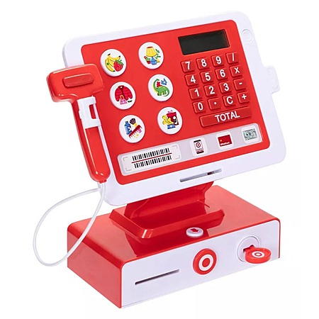 Now you can shop and ring out customers with your very own Target Cash Register! Ring up your items with a real calculator, then pay with pretend money or swipe your credit card to charge it! Comes with shopping accessories and a reusable Target Shopping Bag! Mindfully designed for imaginative & nurturing pretend-play, you little ones will have so much fun scanning items with the hand held scanner and totaling up groceries with the real working calculator. Set comes complete with play money, swipe-able credit card, locking cash drawer with key & more! Durable & easy-to-wipe clean. Batteries included.
