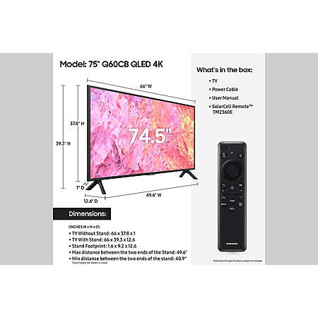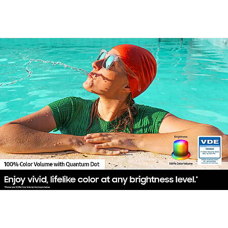 | Product Description: | This lean, mean 4K machine is primed for your leap into Quantum Dot technology—and a bold new world of color and contrast. Take your entire viewing experience to the next level with the elevated audio and astounding picture quality of Samsung QLED. Not only will you see your TV shows and movies instantly transformed into 4K, but you'll also take in a billion shades of unwavering color, beautifully balanced by dedicated warm and cool Dual LED backlights. Details are unveiled with contrast adjusted to ideal levels as each frame is analyzed and refined with Quantum HDR. Beyond amazing visuals, you'll be drawn in by 3D surround sound that moves alongside the action–with even more immersive sound available with the addition of a Samsung soundbar. 100% Color Volume with Quantum Dot - Max out your experience with 100% Color Volume. Take in a billion shades of unwavering color and enjoy vivid, lifelike color at any brightness level as Quantum Dot technology works to create every shade you see on screen; because even a clear blue sky can contain thousands of different colors. Quantum Processor Lite with 4K Upscaling - See your favorite shows and movies in a whole new light with 4K optimization. You'll enjoy enhanced clarity and depth in every scene as our Quantum Processor Lite with 4K Upscaling automatically transforms everything you watch. Dual LED - Don't call it temperamental. You'll enjoy beautifully balanced colors with dedicated warm and cool Dual LED backlights. Get stronger and accurate contrast with innovative technology that adapts automatically to match your content. Whether you're keeping up with live sports or your favorite reality TV shows, you'll get a natural, realistic picture and stronger, more accurate contrast with innovative technology that adapts automatically to match your content. Quantum HDR - Watch the details shine through with Quantum HDR that goes beyond leading standards to create deep blacks, impressive contrast, and picture quality that's analyzed and refined to match the creator's vison. There's no need to search for the perfect display settings, as this powerful technology works automatically to bring you beautifully optimized imagery no matter what you're watching. Motion Xcelerator - Stay cool in the driver's seat. Don't let the action pass by in a blur. Experience smooth motion and improved clarity with Motion Xcelerator. Now you can fuel your need for speed with high-intensity sports, movies, and games, and enjoy crisp and clear details at the same time. The picture on-screen moves smoothly as motion performance features make automatic adjustments so you don't miss a thing. Object Tracking Sound Lite - Get in the mix with Object Tracking Sound Lite. You'll hear 3D surround sound that follows the movement on screen using our incredible virtual top channel audio—putting you right in the middle of the car chase, stampede or party scene. Q-Symphony 3.0 - Amp up your audio with the greatest duo of all time—Samsung TVs paired with a Samsung soundbar. With Q-Symphony, your TV speakers paired with Q-Series and S-Series soundbar operate as one. Together, they can optimize all the channels to bring you a masterfully orchestrated sound experience. It's a completely next-level experience that even works with Object Tracking Sound for an extra layer of depth. Samsung Gaming Hub - Where gaming comes together. Stream your favorite games right from your TV. No console required. *High speed internet connection, additional gaming service subscriptions and compatible controller required. AirSlim Design - Now you see it, now you don't. The AirSlim Design is so thin it practically blends into your wall. SolarCell Remote - Turn up the volume on sustainability with the innovative SolarCell Remote. |