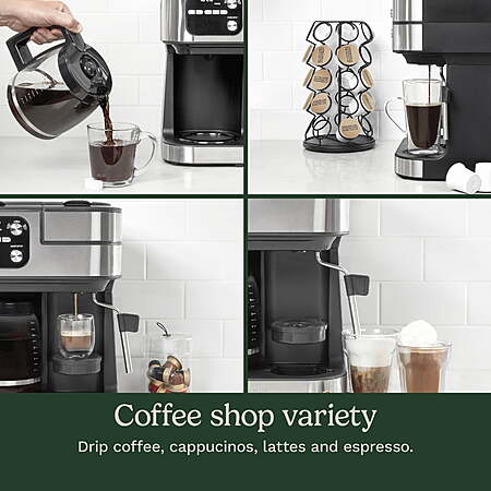 | Product Description: | Bring the café home with the new Cuisinart® Coffee Center® Barista Bar, and experience four brew options with compact convenience. Serve friends and family with 12 cups of fresh coffee brewed to perfection with programmable time, temperature, and strength settings. Or go solo with single-serve cups, in 6-, 8-, and 10-ounce sizes, made in minutes and compatible with most single-serve pods. For extra-bold flavor, pop in a Nespresso® OriginalLine-style capsule, and enjoy a single or double shot of espresso. Add variety to drinks with the steam wand that makes frothed and steamed milk for cappuccinos, lattes, or the specialty drink of your choice. The wand is also perfect for pouring hot water for tea, matcha, hot cereals, and soups. With sleek modern styling and total versatility, this space-saving all-in-one unit is sure to be the favorite spot in any kitchen. New 12-cup glass carafe Fully automatic with 24-hour programmability, Adjustable Keep Warm and Auto shutoff (0–4 hours) Brew Pause™ feature Brew strength control Gold tone, commercial-style, permanent filter Charcoal water filter Single Serve Brewer: Compatible with any brand of single-cup pod, including Keurig K-Cup® pods* 3 brewing sizes: 6oz, 8oz, 10oz 72 oz Removable Water Reservoir Nespresso® Compatible Capsule Brewer: Compatible with Nespresso® OriginalLine-style capsules* Single or Double espresso sizes Steam Wand for hot water, steamed or frothed milk Limited 3-year Warranty |